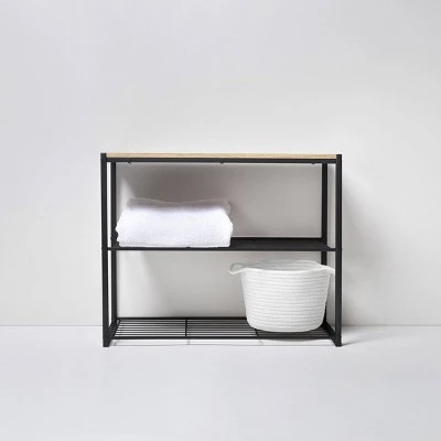 Revamp your entryway or any other space with the functional style of this 3-Tier Shoe Rack from Brightroom™. Constructed with a black metal frame and natural wood top for modern flair, this shoe rack has thin metal rod shelves for a sleek look that lets you air out your shoes. The two built-in shelves provide enough space to store multiple pairs of shoes, while the rectangular top can be used to hold your bags and other accessories. Simply place it against a wall in your mudroom or entryway or inside a bedroom closet to enjoy easy access to your footwear.